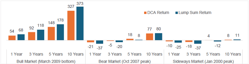 Using DCA to invest at market peaks, like in 2000 or 2007, saw better returns over the subsequent 5-year period compared to lump sum investing. The DCA portfolios cushioned some of the losses in the short term, and by providing a smoother ride, they reduced the emotional strain during the market volatility. However, note that over the longer term of 10 years or more, lump sum investors caught up.
